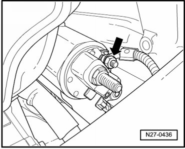 - Remove nut at solenoid Terminal 50 - arrow -.