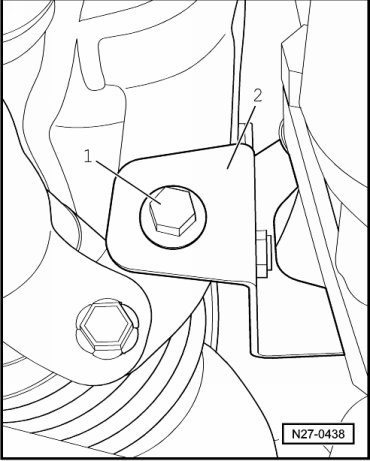 - Remove bolt - 1 - from exhaust system bracket - 2 - from engine side and remove bracket.