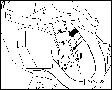 On left A-pillar on emergency (foot) brake bearing bracket -Arrow-