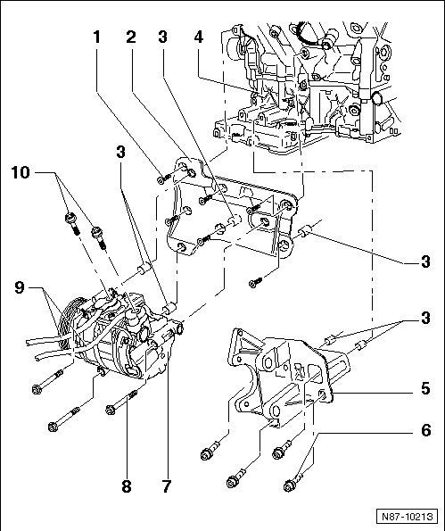 • The A/C compressor sub-assembly bracket and its components can only be removed and installed if the refrigerant is extracted first, for example using the A/C Service Station (VAS 6007A).