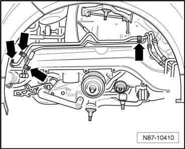 - Remove nuts and bolts - arrows - of retaining clamps for refrigerant line.