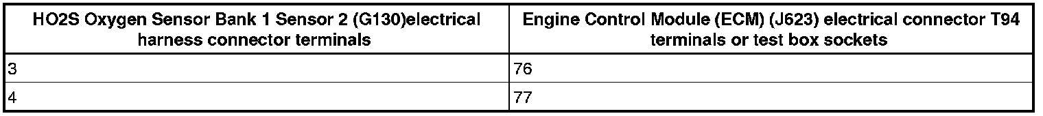 - Using a multimeter, check the HO2S Oxygen Sensor Bank 1 Sensor 2 (G130)electrical harness connector terminals 3 to 4 for voltage.