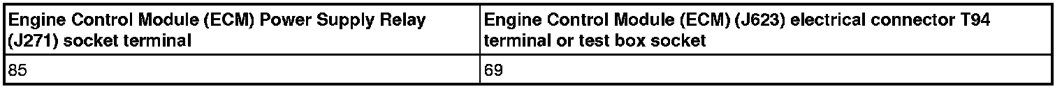- Check the wiring and connections in the power supply circuit to the Engine Control Module (ECM) Power Supply Relay (J271) socket 30 for high resistance, an open or short circuit. Refer to Wiring Diagrams.