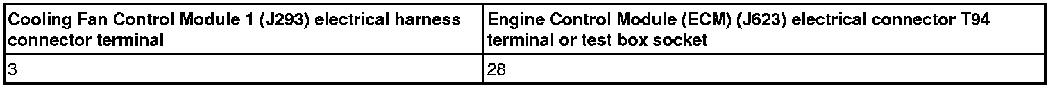 - Using a multimeter, check the Cooling Fan Control Module (-N112-) harness connector terminal 3 to the Engine Control Module (ECM) (J623) electrical harness connector T121 for high resistance, short to ground or voltage, or an open circuit.