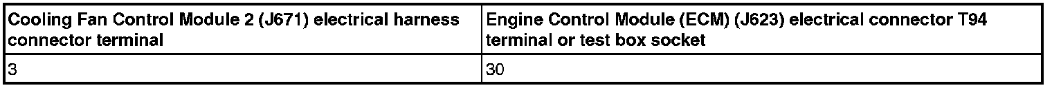 - Using a multimeter, check the Cooling Fan Control Module (J293 or J671) harness connector terminal 3 to ground for voltage.