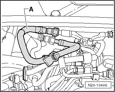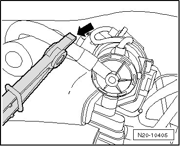 - Disconnect the ventilation line - arrow - to the Evaporative Emission (EVAP) canister purge regulator valve (N80) in the engine compartment.