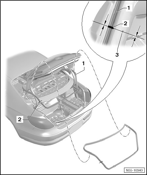 - Align the seal for the rear lid - 1 - with the vulcanization point - 2 - to the opening for the trim clip - 3 -.