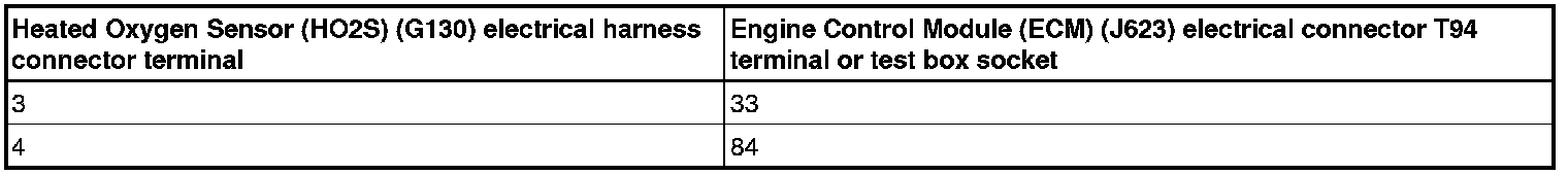 - Using a multimeter, check the Oxygen Sensor (O2S) Behind Three Way Catalytic Converter (TWC) (G130) electrical harness connector terminals to the Engine Control Module (ECM) (J623) electrical harness connector T94 terminals for an open circuit according to the chart below.