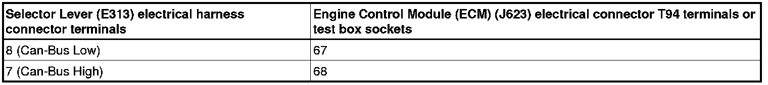 - Using a multimeter, check the Selector Lever (E313) electrical harness connector to the Engine Control Module (ECM) (J623) electrical harness connector T94 for resistance.
