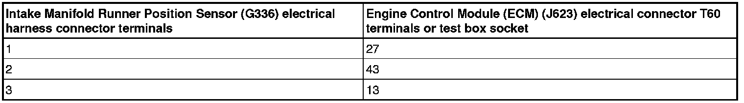 - Using a multimeter, check the Intake Manifold Runner Position Sensor (G336) electrical harness connector terminals 1 to 3 for voltage.