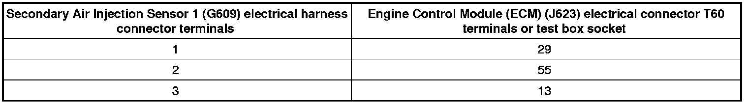 - Using a multimeter, check the Secondary Air Injection Sensor 1 (G609) electrical harness connector terminals to the Engine Control Module (ECM) (J623) electrical harness connector T60 terminals for an open circuit according to the wiring diagram.
