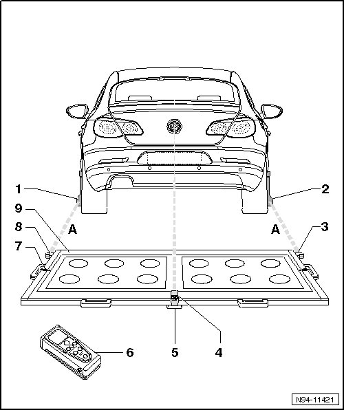 - Position the calibration device (VAS 6350/4) behind the vehicle with a distance of 1.2 m to 1.7 m (4 - 5.5 ft.) between the angled brackets on the calibration device and the paddles at the rear wheel center wheel mounts as shown in the overview illustration - dimension A -, item 9 => [ (Item 9) ].