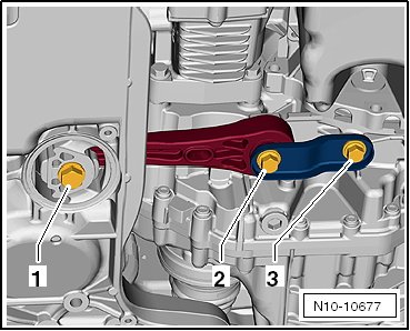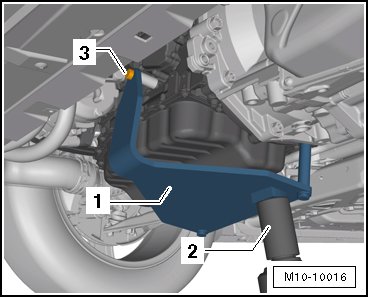 - Secure the engine support (T10359) - 1 - to the cylinder block using the bolt - 3 - and tighten it to approximately 20 Nm.