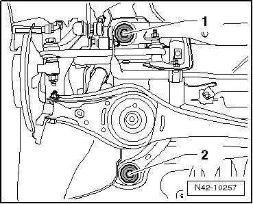 - Loosen the subframe bolts - 1 and 2 - on both sides of the vehicle.
