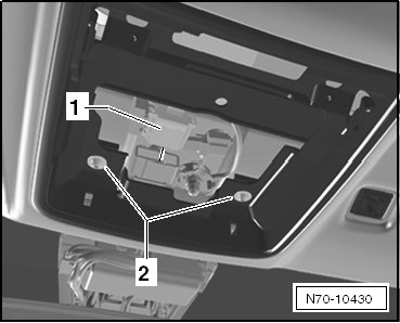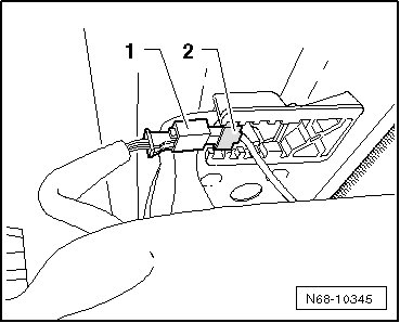 - Grab between the headliner and roof and slightly lift sun visor connector - 1 - and push it in direction of drive over the brace - 2 -.