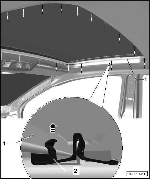 - On vehicles equipped with a Panorama sunroof, remove the clamping profile - 1 - from the mounting clamps - 2 - - arrow -using the release tool (T10236) and the trim removal wedge (3409).