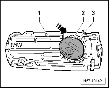 - Install the battery - 2 -, with the positive pole facing upward, tilting it - arrow - into the mount - 3 - for the ignition key - 1 - (the positive pole is marked in the housing).