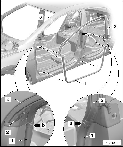 - Press the ends into the front - arrow b - and rear - arrow a - openings on the upper section of the inner door seal - 2 -.