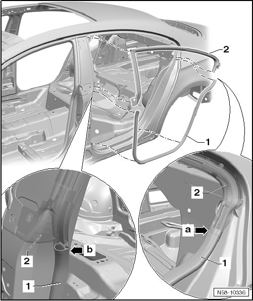 - The seal is placed on the sheet metal flange on the B-pillar and in the rear area of the C-pillar. Also remove the seal - 2 - at this time.