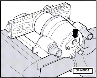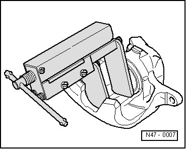 Place a wooden board into the recess of the caliper housing so it is not damaged.