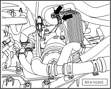 - If the engine oil cooler is installed here, then remove the coolant hoses from the engine oil cooler - arrows - and move them to the side.