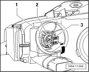 - Pull the cornering lamp bulb at the connector back out of the reflector - 3 -. Be careful of the connected wires.