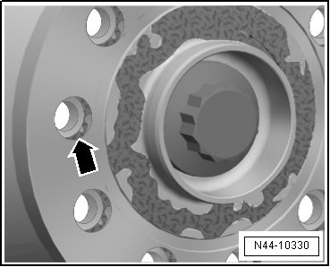 - Check whether the wheel bolts can be easily installed by hand. The threads of the wheel bolts must not touch the holes in the brake rotor - arrow -.