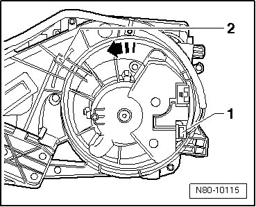- Disengage locking mechanism - 2 - and then turn and remove the fresh air blower and the fresh air blower control module - in the direction of arrow -.