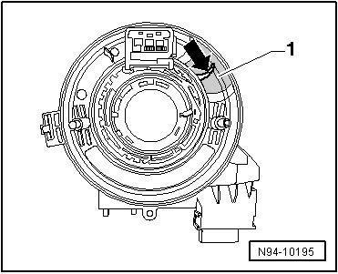 - Lift both retaining straps - arrows - on Airbag Spiral Spring/Return Spring With Slip Ring (F138) - 1 - slightly and pull off Airbag Spiral Spring/Return Spring With Slip Ring (F138) toward rear from steering column.