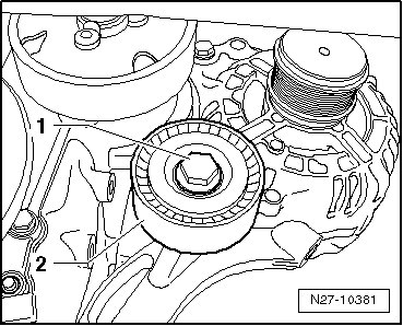 - Remove the nut - 1 - on the tensioner - 2 - and remove the tensioner.