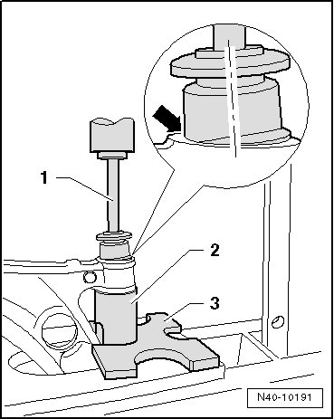 - Place the bonded rubber bushing in at an angle (in the direction of the control arm), when doing this, the lip - arrow - must slip into hole as shown in the illustration.