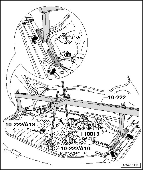 - Then, lower the engine and transmission using engine support bridge (10-222 A) spindles about 6 turns.