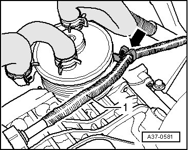 - Disconnect the selector lever cable - 1 - from the bracket - arrow - on the transmission.