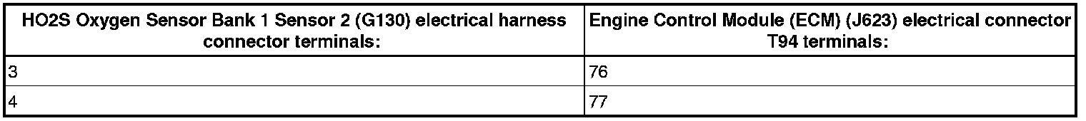 - Using a multimeter, check the HO2S Oxygen Sensor Bank 1 Sensor 2 (G130) electrical harness connector terminals to the Engine Control Module (ECM) (J220) electrical harness connector T94 terminals for an open circuit.