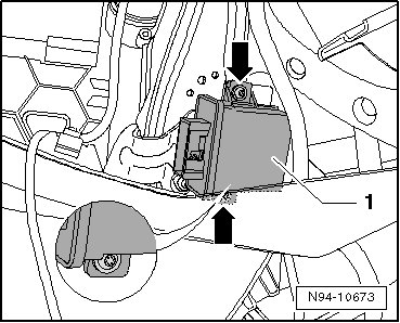 - Remove the bolts - arrows - and the headlamp range/cornering lamp control module - 1 -.