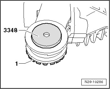 - Remove the bonded rubber bushing - 1 - using the front and rear bearing tool (3348) and a plastic mallet.