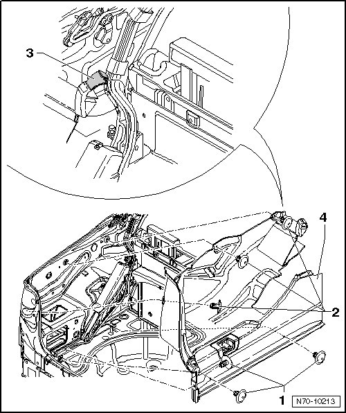 - Open film hinge - 3 - and remove trim - 4 - from luggage compartment.