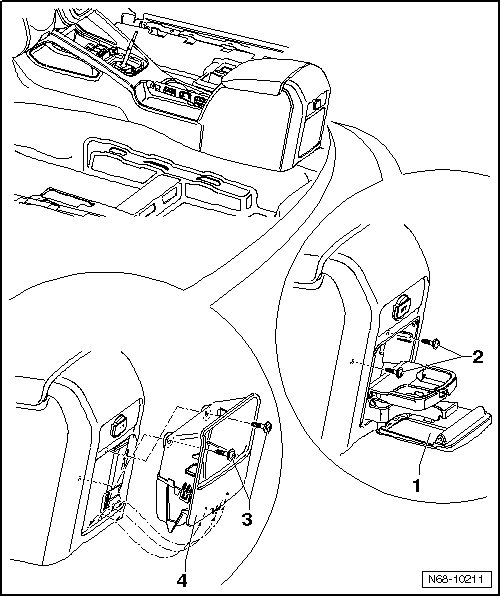 - Remove storage compartment - 3 - from center console and (depending on vehicle equipment) disconnect wiring harnesses.