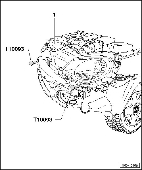 - With a second technician, remove guide rod (T 10093) on longitudinal member on left and right sides and lift out lock carrier.