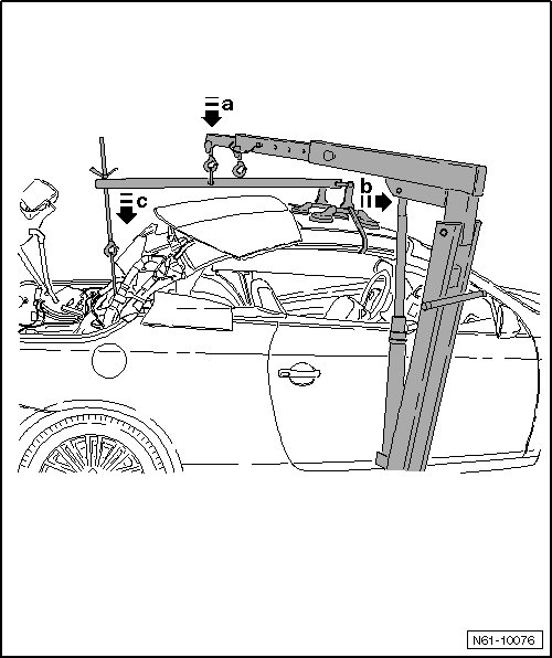 - Lower roof - arrow a - into vehicle until roof with roof pillar can be guided into locking bracket on windshield frame - arrow b -.
