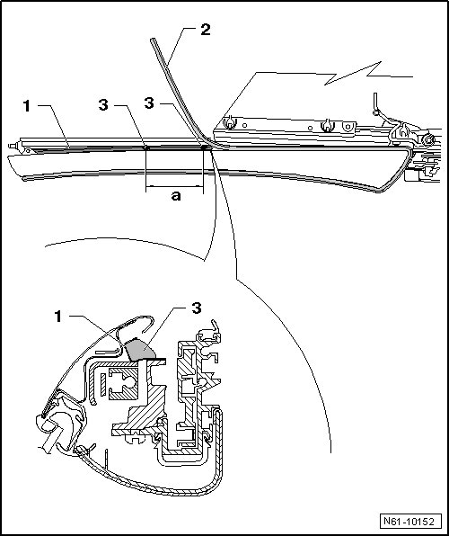 - Press a Butyl Cord (D 450 273 A2) - 3 - formed into a ball on end of guide rail firmly onto water guide foil - 1 -.