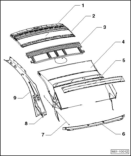 • Removing, refer to => [ Tensioned Headliner Rail, Removing ] Tensioned Headliner Rail, Removing