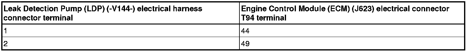 - Using a multimeter, check the Leak Detection Pump (LDP) (-V144-) electrical connector terminals to Engine Control Module (ECM) (J623) electrical connector terminals for an open circuit or high resistance.