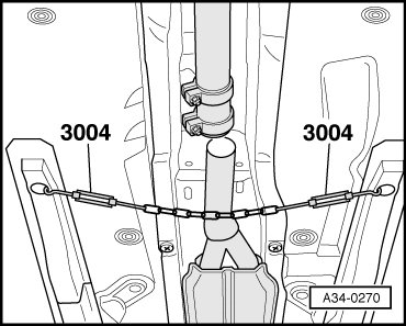 - Tie up the exhaust system with a chain. To do this, insert the hooks (3004) into the openings at the vehicle floor (remove the plugs, if necessary).