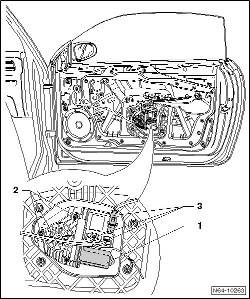 - Install the window regulator motor - 1 - and pull door window up and down so that splines are located better between motor and cable drum.