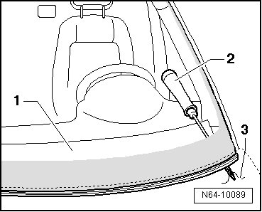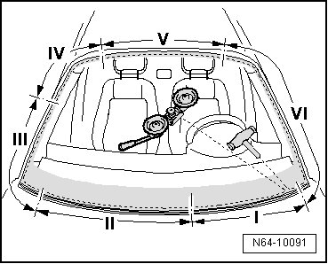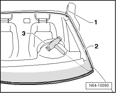 - Push cutting cord end - 3 - using awl (V.A.G 1474/2) - 2 - through adhesive sealing material into the vehicle interior.