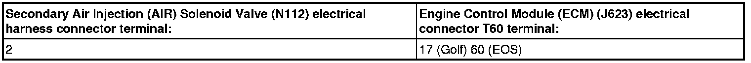 - Using a multimeter, check the Secondary Air Injection (AIR) Solenoid Valve (N112) electrical harness connector to the Engine Control Module (ECM) (J623) electrical harness connector T60 for an open circuit.