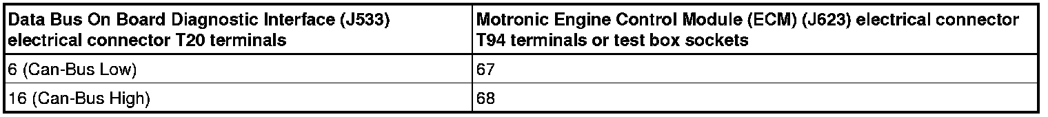 - Using a multimeter, check the Data Bus On Board Diagnostic Interface (J533) electrical harness connector to the Motronic Engine Control Module (ECM) (J623) electrical harness connector T94 for resistance.