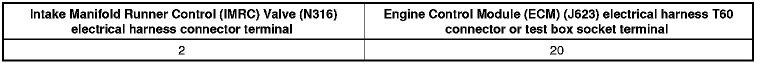 - Using a multimeter, check the Intake Manifold Runner Control (IMRC) Valve (N316) electrical harness connector terminal to the Engine Control Module (ECM) (J623) electrical harness connector terminal for resistance.