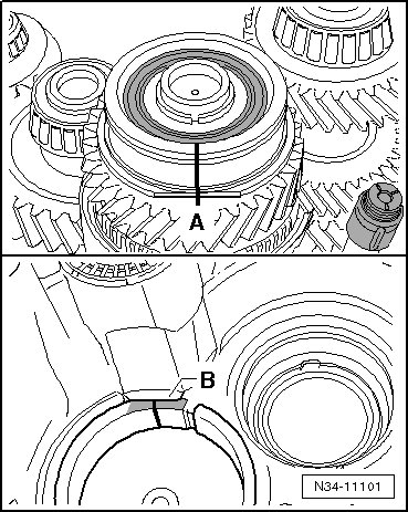 The groove for the lock ring faces up - arrow A - and the collar - arrow B - must face the 5th gear.
